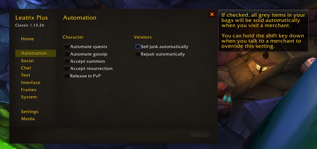 • Автоматически продавать хлам — Продавать все серые предметы из ваших сумок при разговоре с торговцем;