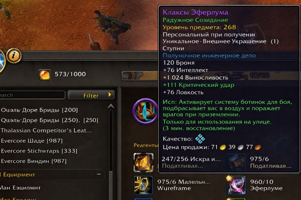 Эта способность позволяет вам уничтожать 5 созданных реагентов из других профессий, чтобы получить инженерные реагенты Астраволокно и Вечноядро. Разные уничтоженные предметы дают разные типы и количество этих реагентов. Мы предлагаем Порошковый пигмент в качестве дешевого источника Вечноядра и Сумрачный сплав для Астроволокна, идеальный вариант — покупать очень дешевые готовые предметы на аукционе. Обычно это товары массового производства для прокачки, которые не имеют практического применения для других игроков и поэтому продаются очень дешево!