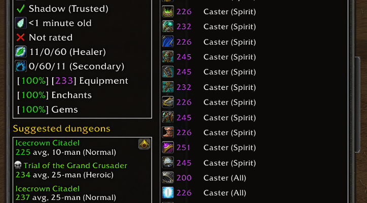 Аддон Elitist Group [WotLK 3.3.5] – это аддон для World of Warcraft, который позволяет быстро и удобно оценивать экипировку и навыки игроков в вашей группе или рейде.